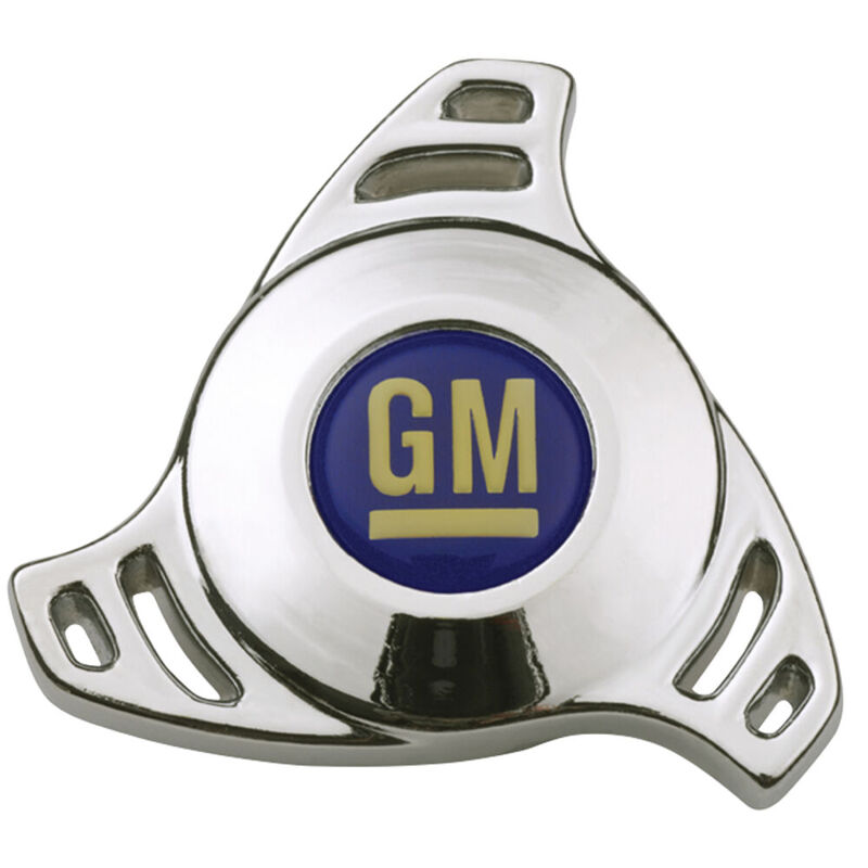 ac delco, large hi-tech gm emblem air cleaner center nut, chrome; blue gm circle logo; large tri-wing style