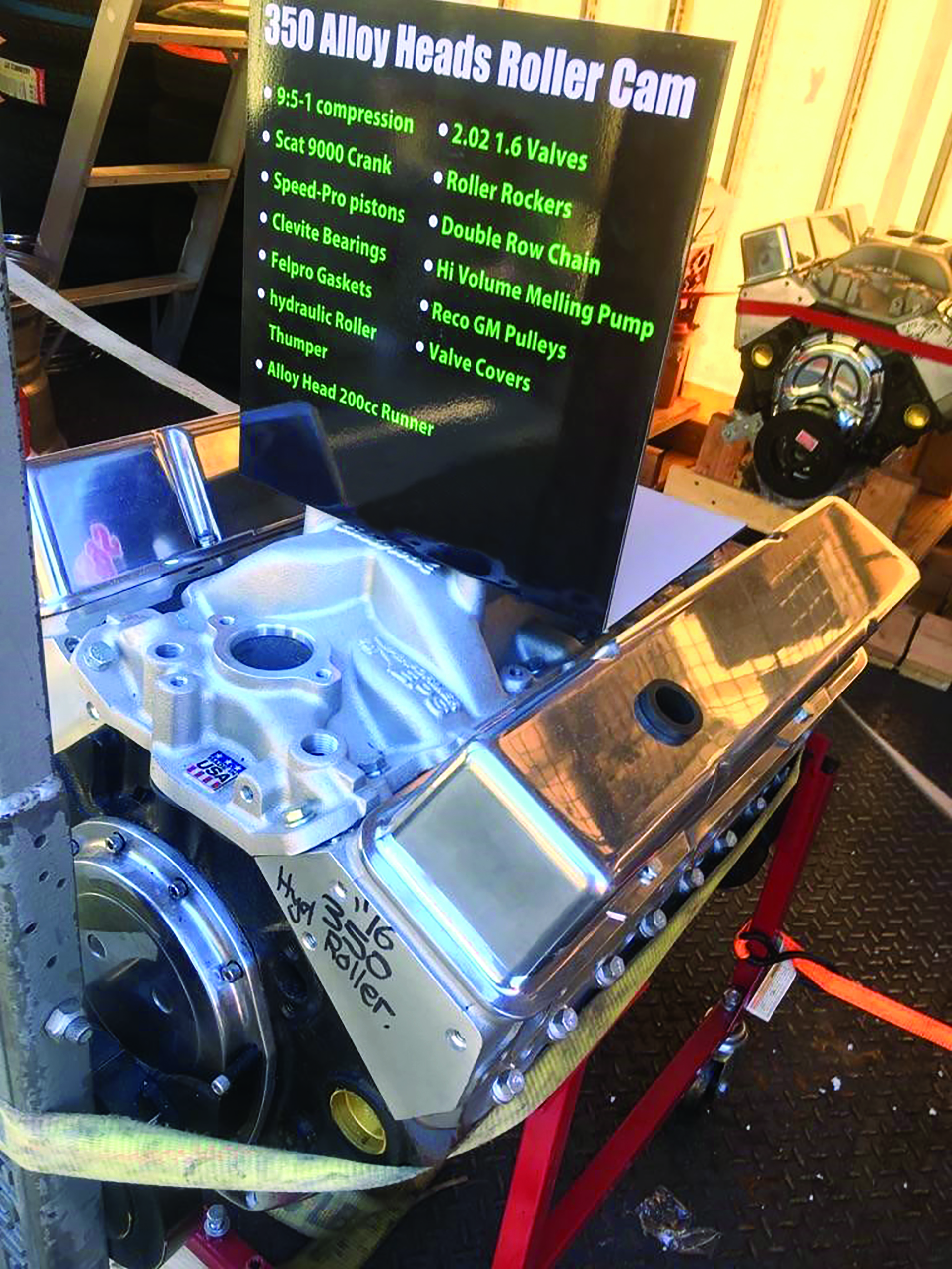 9:5-1 compression, Scat 9000 crank, Speed-Pro pistons, Clevite bearings, Felpro gaskets, hydraulic roller thumper, alloy head 200cc runner, 2.02 1.6 valves, roller rockers, double row chain chain, Hi-Volume Melling pump, reco GM pulleys and valve covers. #008
