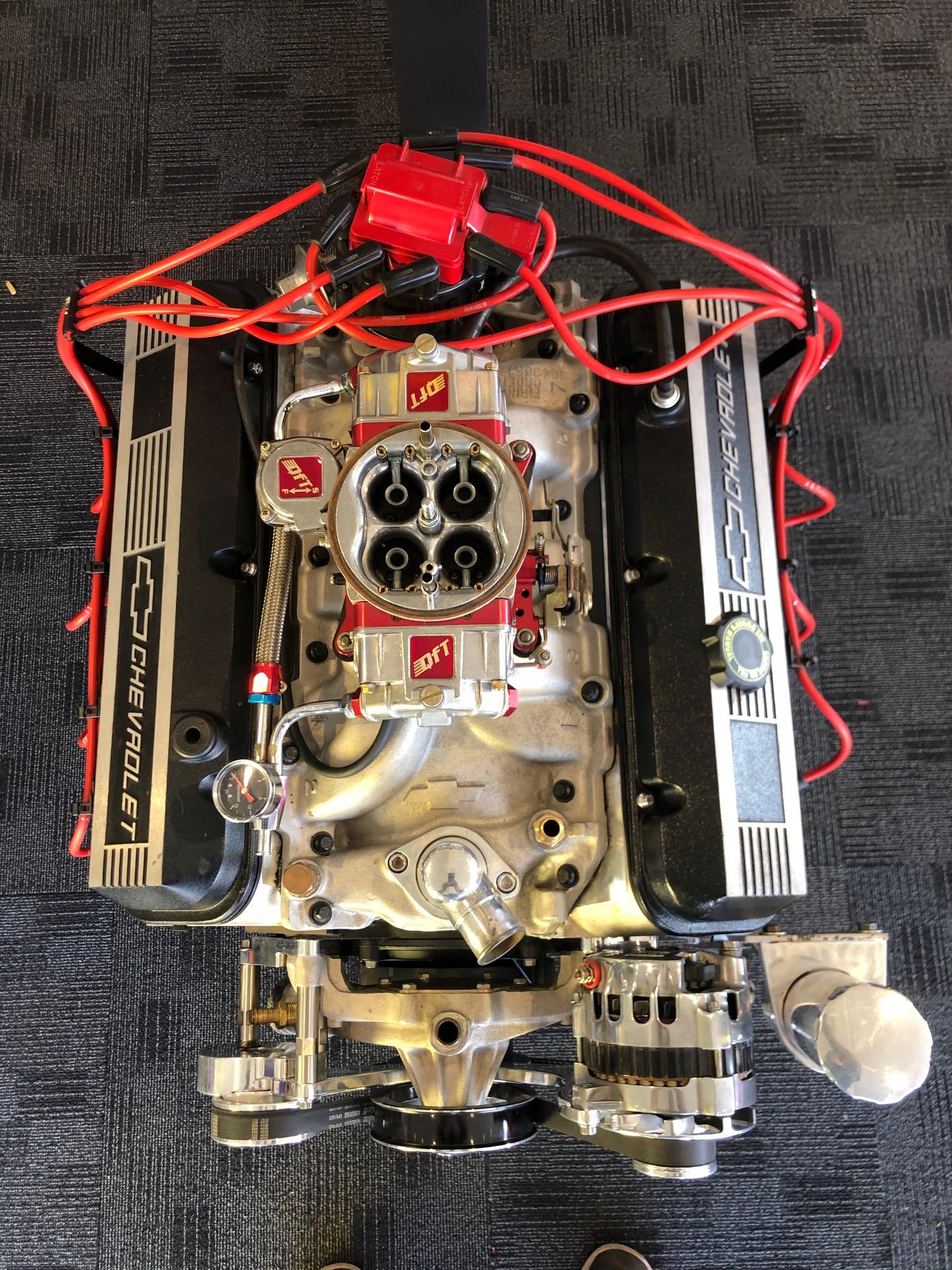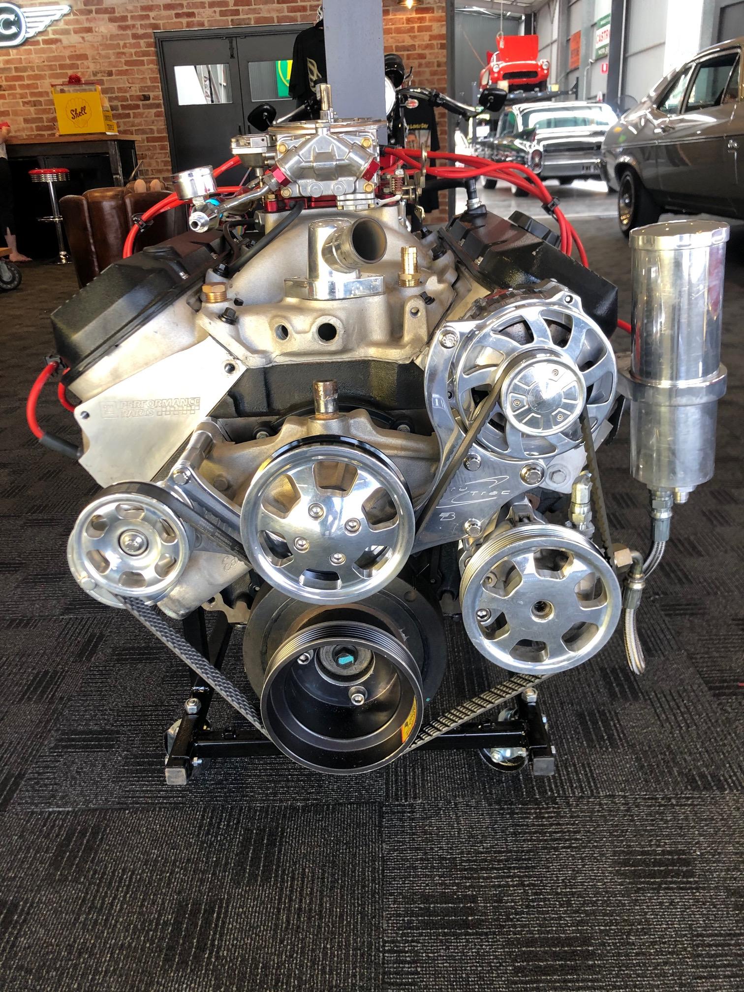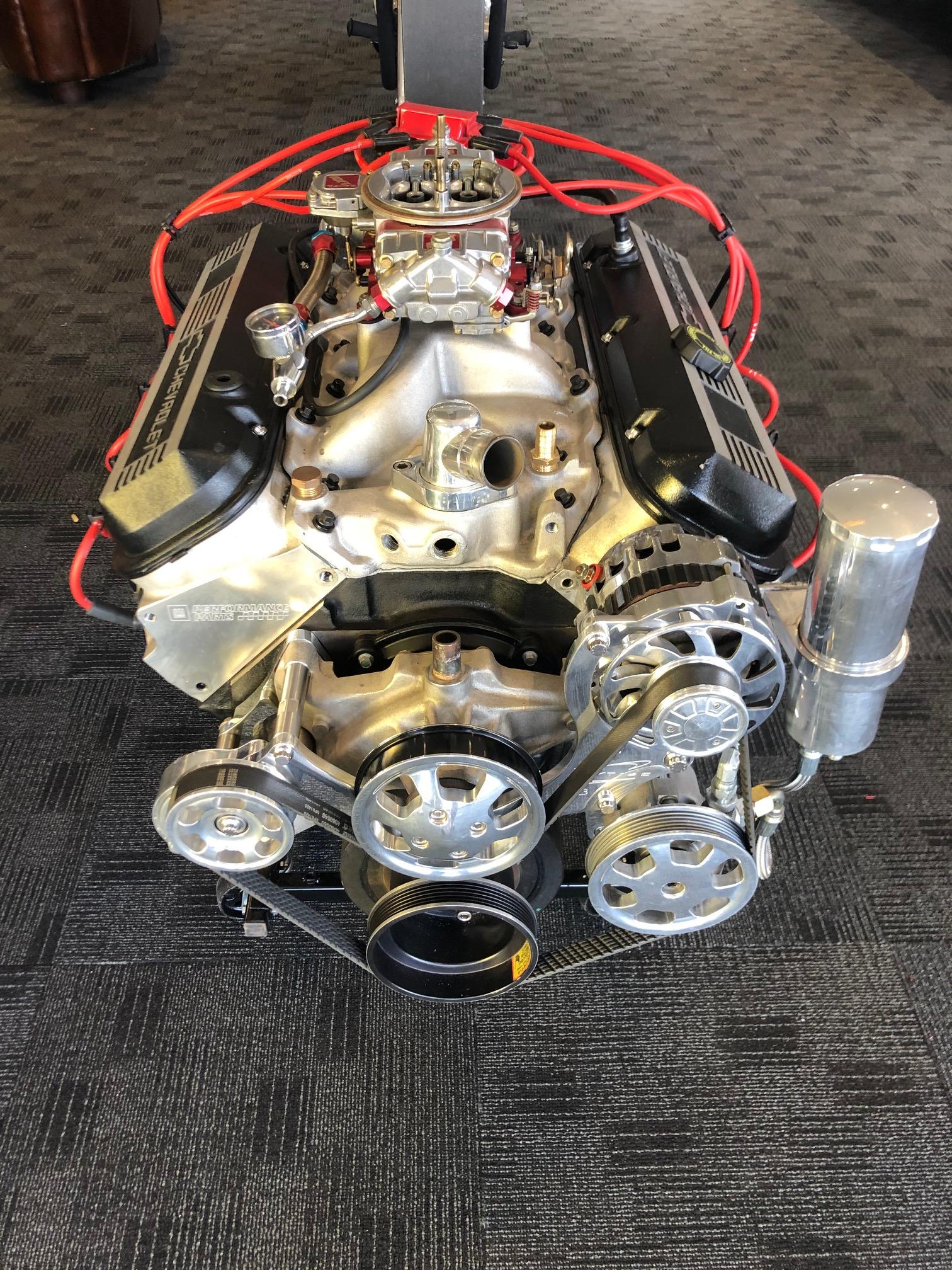 Complete 502 ci engine with 508 HP - 567 FT/LB Torque. Features include 4.470 x 4.000 bore x stroke, forged steel crankshaft, forged aluminium pistons, hydraulic roller camshaft, 9.6:1 compression ratio, 870-cfm carburetor, Serpentine pulley system and power steering. Fully assembled for easier installation in your hot rod, street rod or sportsman racer. Engine stand included. Replacement cost in excess of $ 22,000. Already run in (approximately 1,200 km).