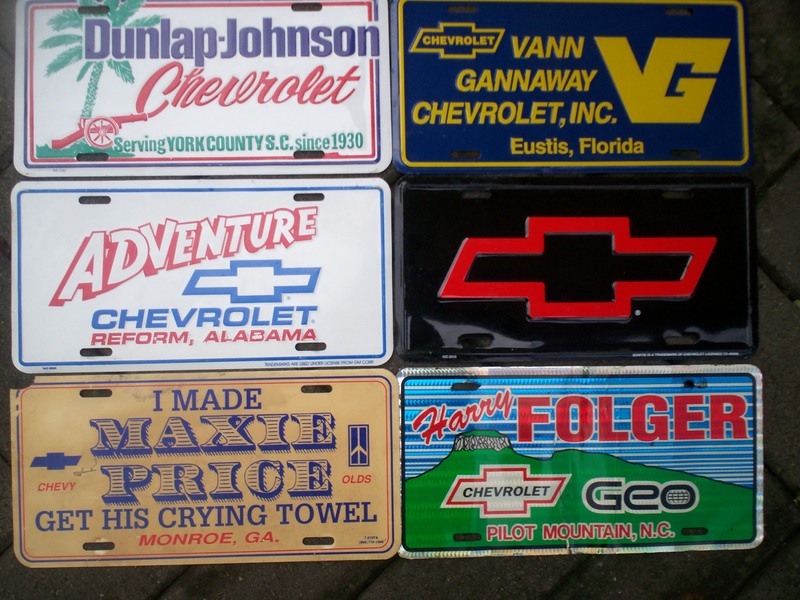 CHEVROLET USA (6) dealer booster plates. (5) metal, (1) plastic.