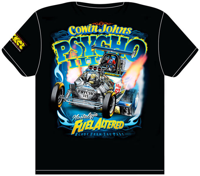 These killer black t-shirts feature the 'Psycho III' Nitro Fuel Altered on the back and Cowin & Johns logo on the front. Quality screen printed designs pop out with vivid colours. Shirt are 100% cotton, 6.1oz. preshrunk and feature double-needle stitching throughout with seamless top stitched collar and taped neck and shoulders.