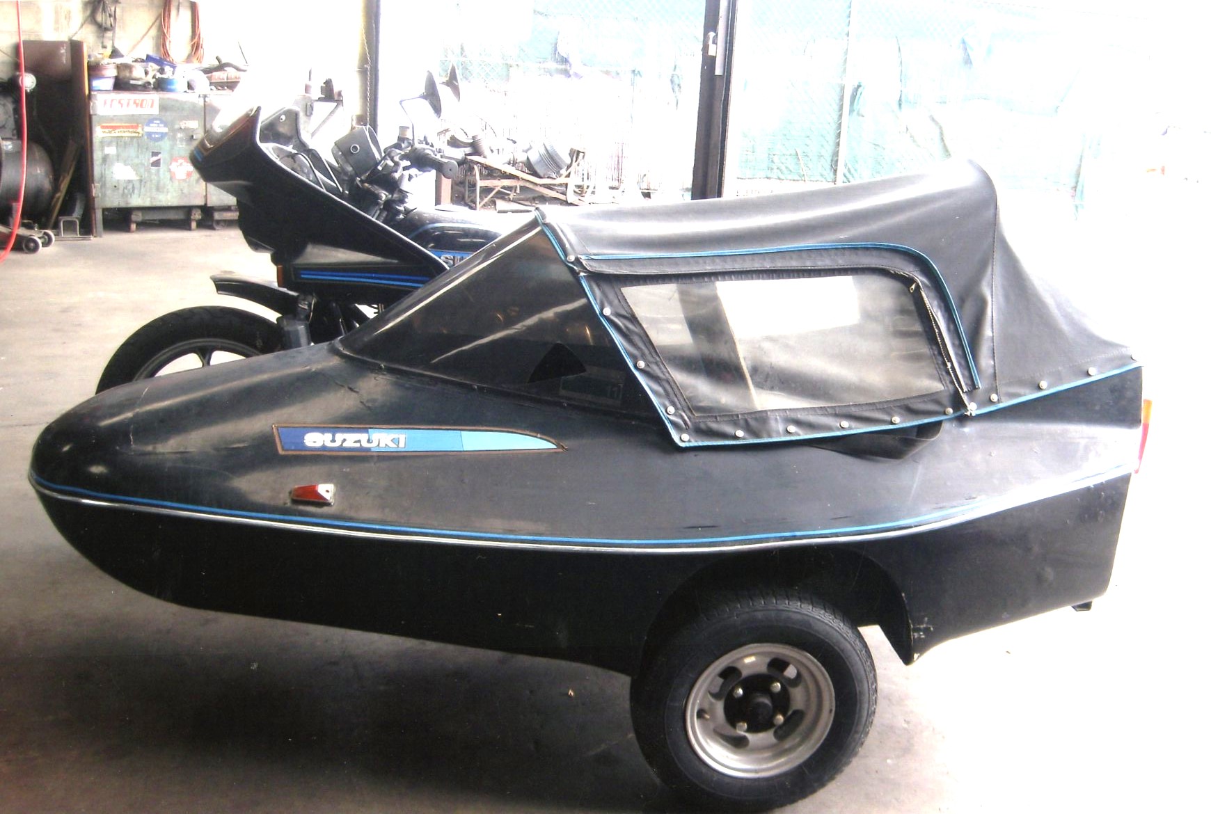 7ft long unit construction sidecar with integral roll bar, full tonneau lockable boot, hydraulic dis brake, separate park brake calliper, coilover shock suspension, some mounting brackets supplied, needs fibreglass repairs.