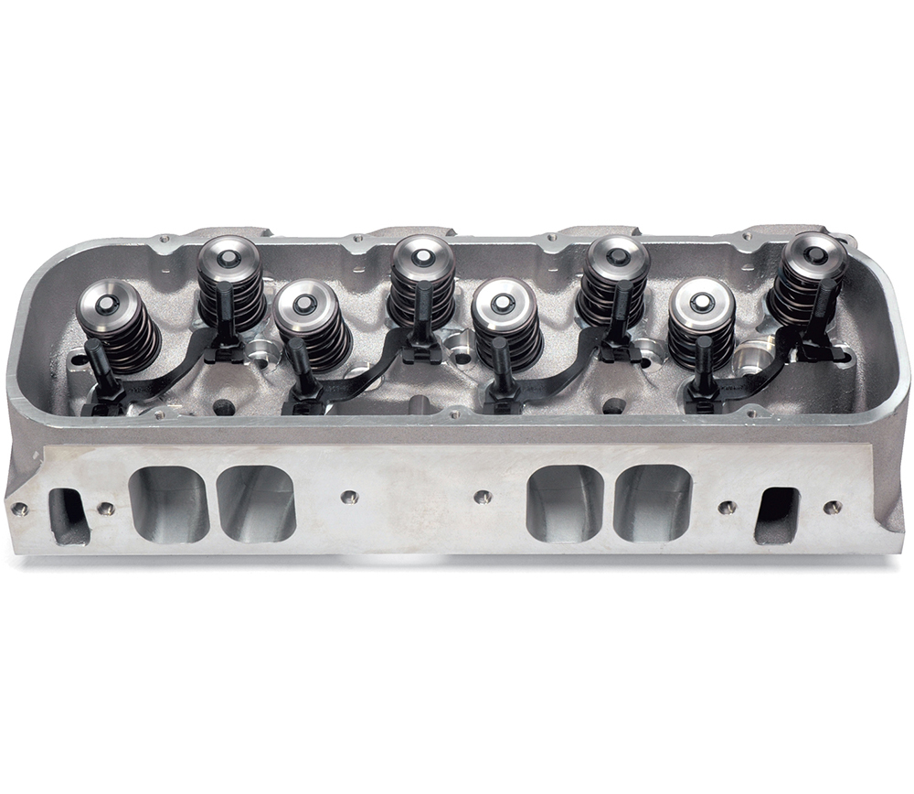 Edelbrock and Pat Musi Performance have combined efforts to produce the finest standard intake port location big-block Chevy head available. These heads feature an extra thick deck and extra material in the spring pockets for a heavy-duty casting that can be used with high-lift cam and heavy spring combinations. Edelbrock equips the complete heads with Manley dual-spring valve springs and titanium retainers good for up to .880" lift. The port designs are large oval (367 lh / 377 rh) that produce impressive flow - out-of-the-box. The exhaust port exits are raised .750" to greatly improve exhaust flow and power. Off the shelf large oval-port intakes are available through Edelbrock.