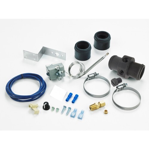 The switch is adjustable from 40°C to 100°C (104°F to 212°F) and installs directly into the top radiator hose using the included Inline Sensor Adaptor. The kit includes all necessary components for a watertight, effective installation.