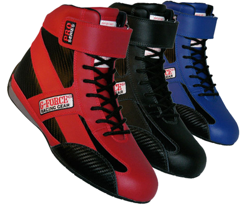 This is the all new GF Pro Series Racing Shoe with Radial-Grip™ treaded sole. Inspired from the world's best high performance tires, the sole of this shoe will meet every demand of competitive driving. The tread rolls up the back and has chamfered edging to prevent any catches in a heated pedal exchange. The Radial Grip™ sole also is loaded with multiple tread channels to move cooler air between your feet and the floor pan of your race vehicle. This shoe is made in Black Blue or Red all with carbon fiber printed leather insert for styling features. The laces on the Pro Series Racing Shoe are secured under a Velcro™ enclosure to stop annoying slack from coming loose. The back of this shoe has a deep cut-out where the shoe meets the back of the leg to allow for the rolling and rocking that comes with performance driving. These Shoes are produced to accent the new Pro Series Race Glove and are SFI 3.3/5 Rated.