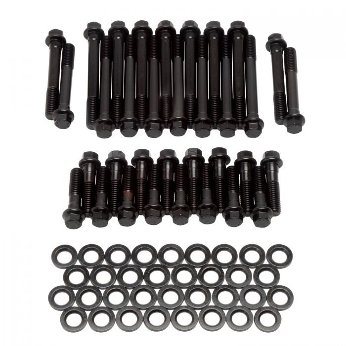 The Edelbrock #8550 bolt kit contain a complete set of the highest quality head bolts and hardened washers available. Cold-formed to ensure molecular integrity and heat treated prior to thread rolling and machining. Reduced diameter bolt heads eliminate the need for valve train removal to facilitate cylinder head re-torqueing. Hardened and parallel-ground washers are included. Rated at 170,000 p.s.i.