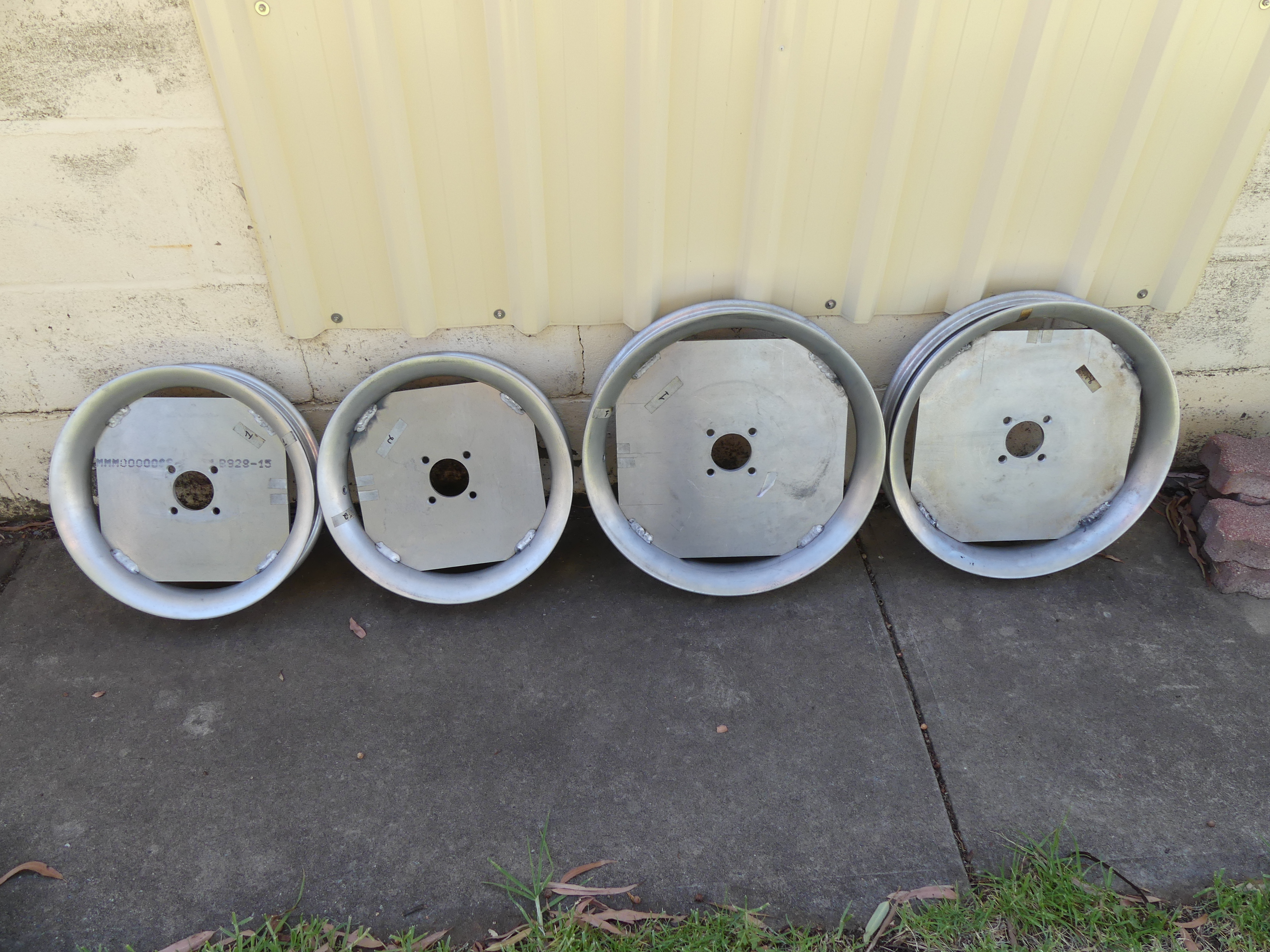 For use in transporter, pits and garage All wheels are 4 stud 4 inch P.C.D Front wheels are 16 inch diameter x 3 inch wide Rear wheels are 19 inch diameter x 3 inch wide Are designed to run motor cycle tyres Will only sell in sets of 4 (2 front 2 rear).