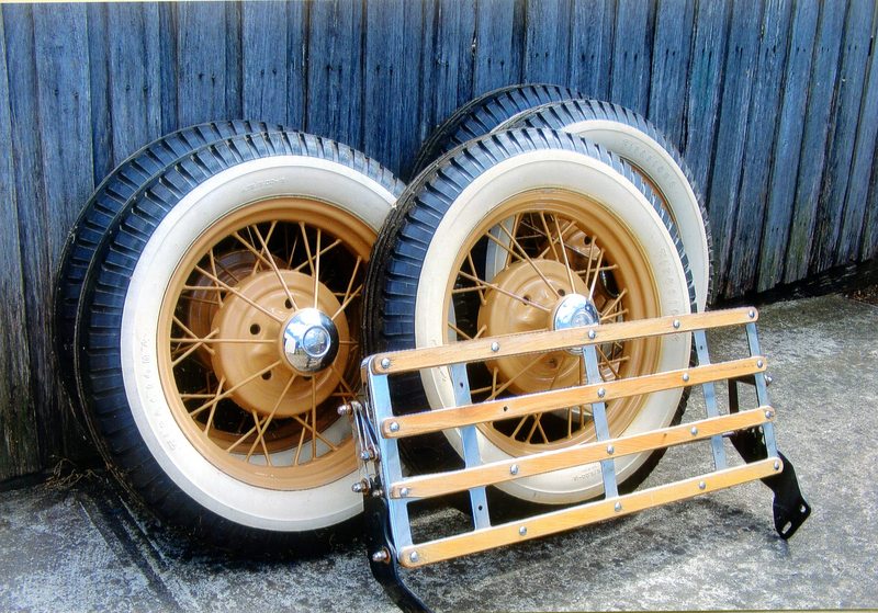 FORD 1930 MODEL A WHEELS and tyres, near new Firestone white walls 4075/5.00 x 19 inch set of 5 plus luggage rack and brackets $750 the lot.