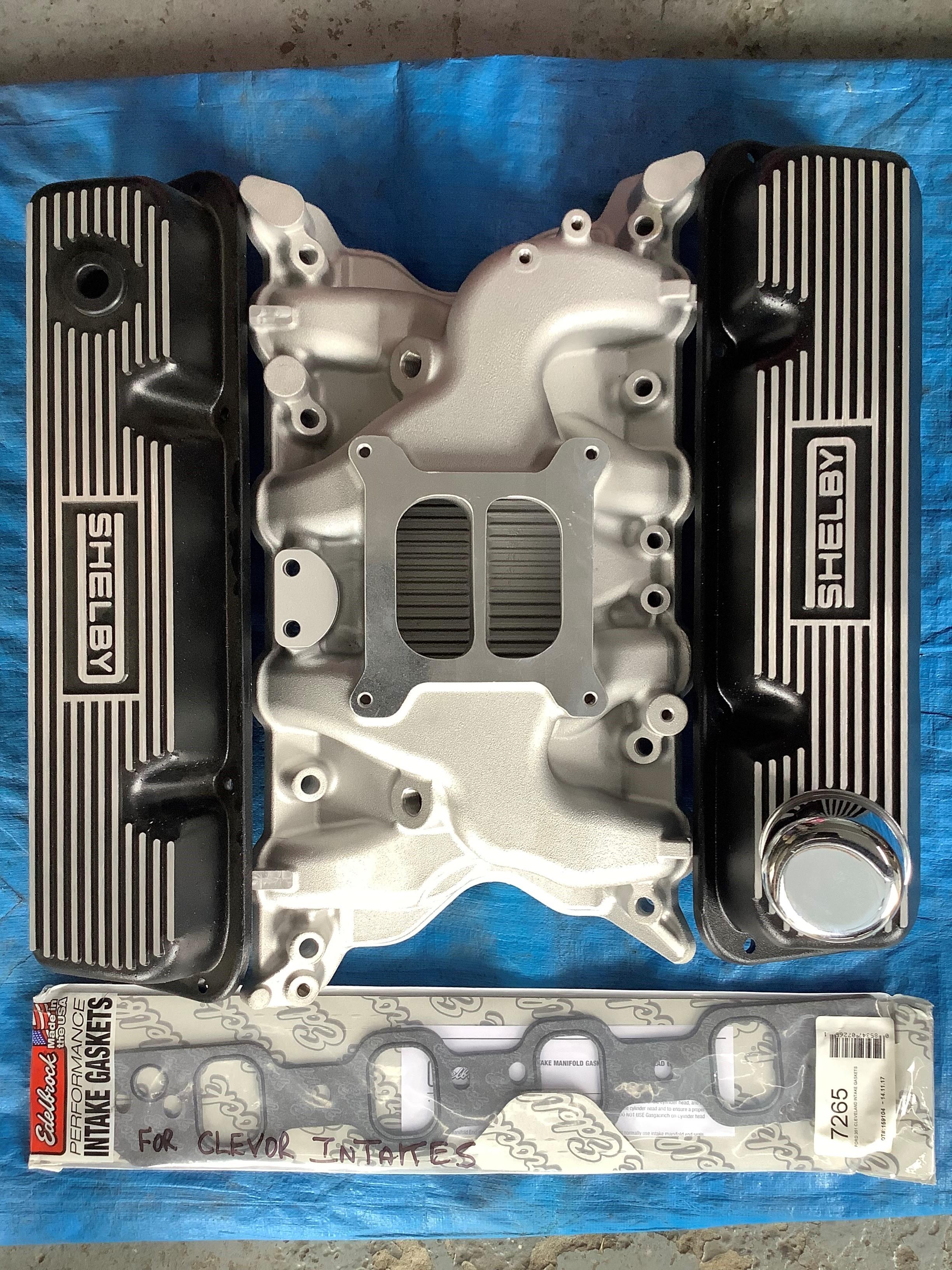 Includes alloy 2v dual plane intake, Shelby black alloy valve covers, breather cap, stud kit and gaskets to suit, looks great and works well. Phone Jonathan.