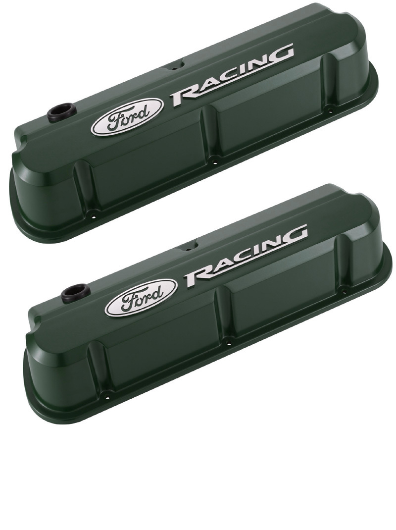 ford racing die-cast valve covers, slant-edge, green, raised emblems.