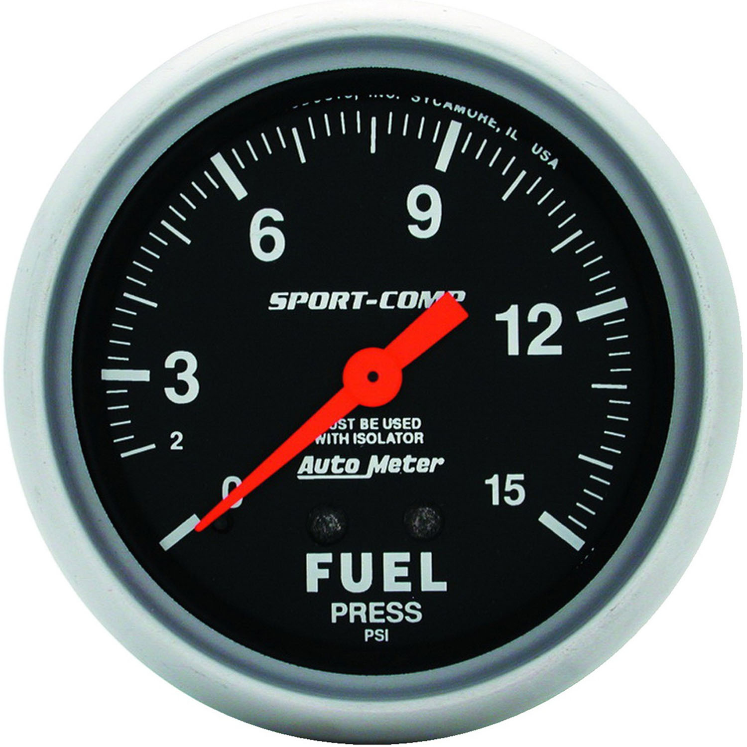 autometer gauge, sport-comp, fuel pressure, 2 5/8 in., 15psi, mechanical w/isolator, analog, each