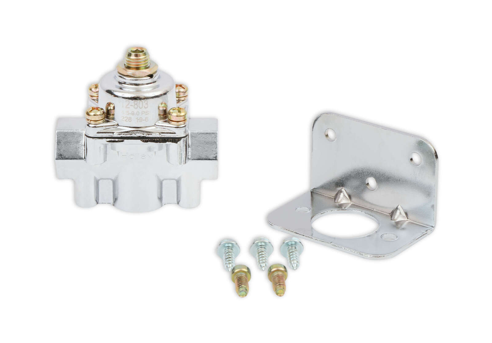 Holley fuel pressure regulators are designed to precisely control the fuel pressure from the fuel pump to the carburetor. Too much fuel pressure for a given needle and seat assembly can overload the needle and seat and may cause flooding or drivability problems. Each Holley fuel pressure regulator is fully adjustable so regulating the fuel pressure to your engines needs is a simple task. All Holley regulators are pre-set at the factory so there is no guesswork when first installing the regulator. The Holley 12-803 fuel pressure regulator features 3/8" NPT in/out ports.Features:Adjustable fuel regulation from 4-1/2 to 9 psi .220" (7/32") restriction 3/8" NPT ports ( 1 in, 2 out) Chrome finish Mounting bracket included