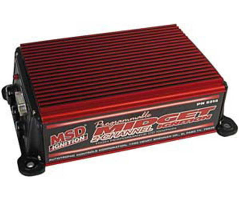 The Programmable Midget Ignition is a complete electronic distributorless system consisting of a powerful capacitive discharge Ignition Control, a four tower high output coil pack and uses two non-magnetic pick-ups with a trigger wheel as a crank trigger source. This takes all of the mechanical variables out of the picture to produce exact ignition timing! Adding to the accuracy and high output of this ignition system, is the advantage of being able to precisely program the timing throughout the engine’s entire rpm range. By using the optional Hand Held Programmer, PN 7550, or MSD’s Pro-Data+ software package on a Windows based PC, racers can program two different timing curves down to .1° per 100 rpm increments! Other features of the Programmable Midget Ignition include a rev limiter to protect the engine from overrev damage, a start retard and a circuit that monitors the battery supply voltage. The Midget Ignition produces full power capacitive discharge sparks at any rpm so you can be assured of complete combustion. To control this power and the programs, a 15 MHz microcontroller analyzes the various inputs and is capable of extremely quick compensations to maintain exact timing and rpm. The Midget Ignition is supplied with the Ignition Control, two Non-Magnetic Pick-ups, Trigger Magnet, On/Off Switch and Software.