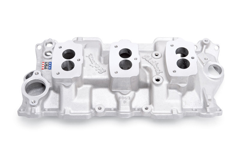 Designed for 1955-86 262-400 c.i.d. small-block Chevys, this manifold has a balanced 180° firing order port runner arrangement. It contains an exhaust gas heat crossover and offers excellent performance potential. #5418/#5419 has machined front oil filler tube pad with boss. #5418 is machined for 3-bolt carburetors. Carb center-to-center: 5-1/2". Use with Performer-Plus camshaft and lifter kit #2103 for low-end torque or Torker-Plus cam/kit #5002 for top-end power. #5418 & #5419 accept Oil Fill Tube and Breather #4803.