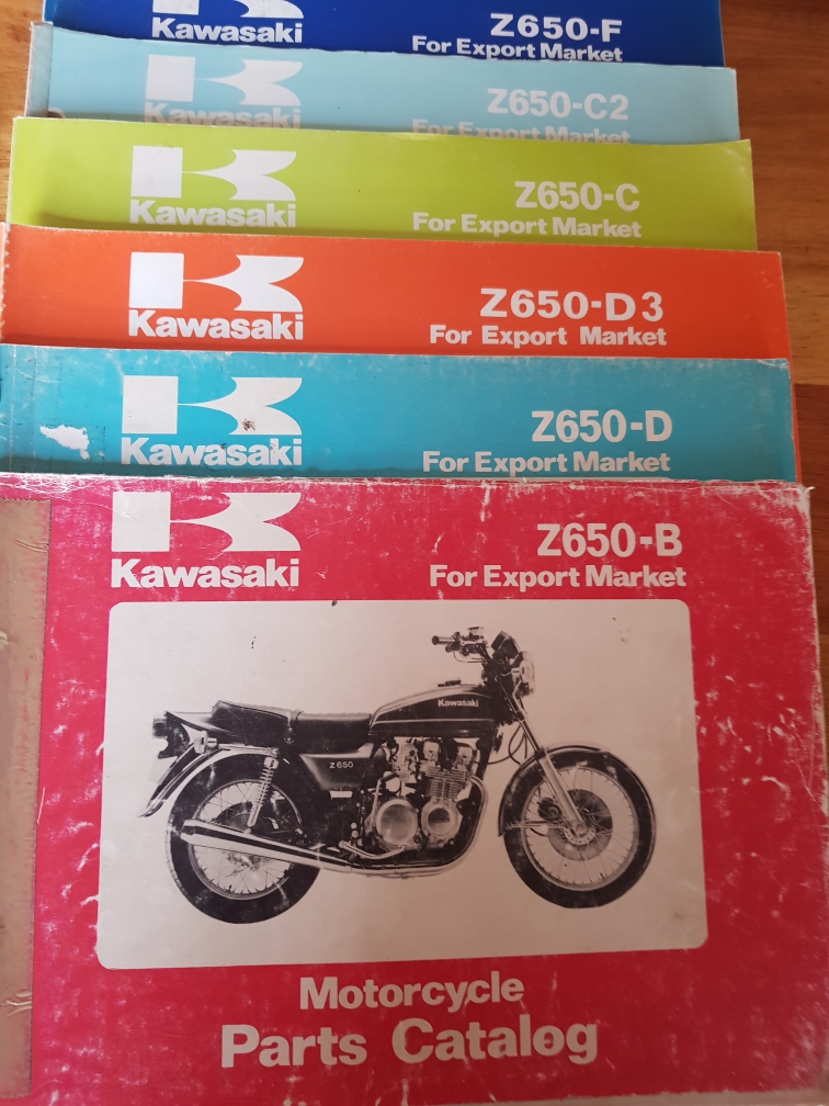 Z650 C2 & C3, gen, 1977, also Z650C2 gen, S1978, also Z650 D2 gen,1978, also Z650 D3 gen, Feb 1980, also Z650F, Dec 1980 Parts books.