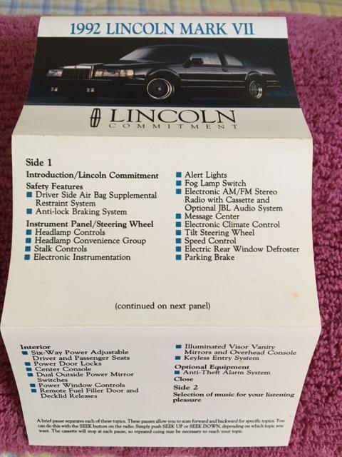 New/Old Stock factory issued, features of the 1992 Lincoln Mark VII. Music on one side. Stored on shelf since new-never used.