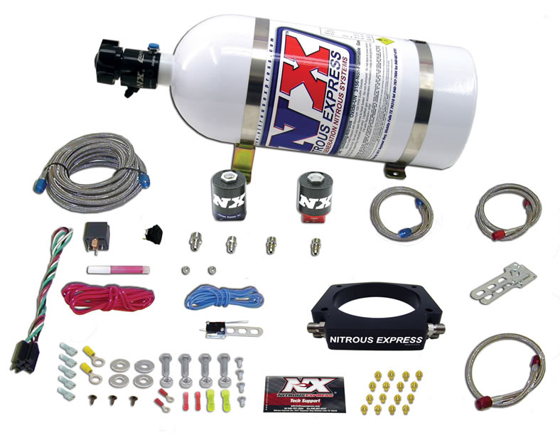 The plate is pre-machined with a second set of nitrous and fuel passages so you can easily upgrade to a dual stage system by adding part # NX933D. This system includes ProPower Lightning series solenoids, 10lb bottle with the Lightning 45 bottle valve, 6AN feedline, braided stainless solenoid to plate lines, stainless bottle brackets, master arming switch, WOT switch as well as every nut, bolt and electrical connector needed to complete the installation.