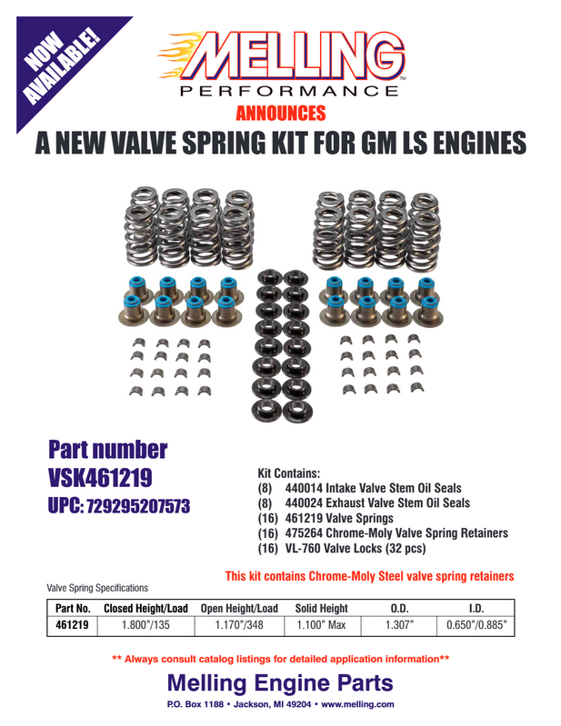 Melling valve spring kits cover the market and your requirements. Standard, mid-range, heavy-duty and race ready applications are available from Melling in a variety of wire sizes, materials, and spring pressures. Melling spring designs include standard and dual springs with and without dampers as well as new beehive applications. Performance valve locks, seals, and retainers included are designed to increase performance and durability. Whatever your valve spring kit needs may be, Melling has a variety of quality valve spring kits to fit your requirements.