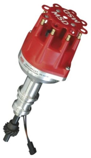 MSD fit all of their high performance distributor experience into a special compact housing designed to be less obtrusive for Ford engines. The diameter of the special cap and housing are 5/8" smaller than stock Ford distributors providing extra room in front of the engine. The new MSD cap features spark plug style terminals and is firmly screwed down to the housing. The distributor relies on MSD's race proven magnetic pickup and precision reluctor to deliver accurate trigger signals to the MSD Ignition throughout high rpm. The reluctor assembly is turned by a hardened steel shaft which rides in a sealed ball bearing for high rpm stability and endurance. Mounted to the top of this shaft is a fully adjustable mechanical advance assembly. The rate at which the chro-moly assembly advances the timing is easily controlled by changing the supplied advance springs and stop bushing for total advance.
