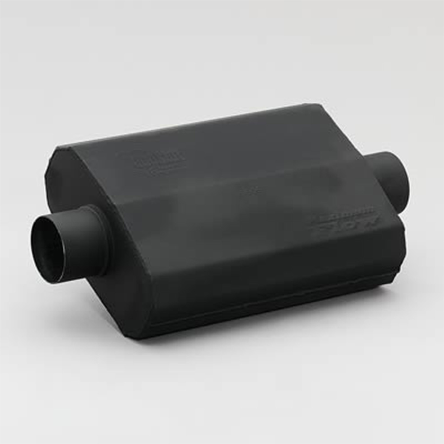 These Hooker Maximum Flow mufflers allow 99 percent more exhaust flow and produce more horsepower and torque than a 2 1/2 in. open pipe. They're constructed from aluminized and stainless steel and use high-temperature packing material to absorb excessive noise, while allowing a rich, low-toned sound. As with all absorption-type silencers, the Maximum Flow mufflers will be most effective for sound control on lower-compression (8.5 to 1 and lower) motors with conservative camshafts and on applications using catalytic converters. The Maximum Flow mufflers flow either direction, allowing for easy installation.
