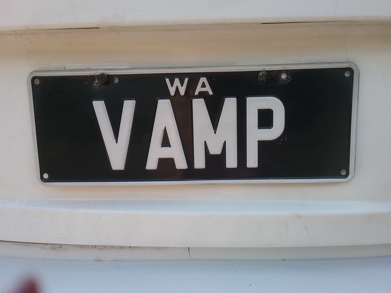 'VAMP' personalized plates, black with white script and border. Small front plate, larger back plate. MAKE A STATEMENT!