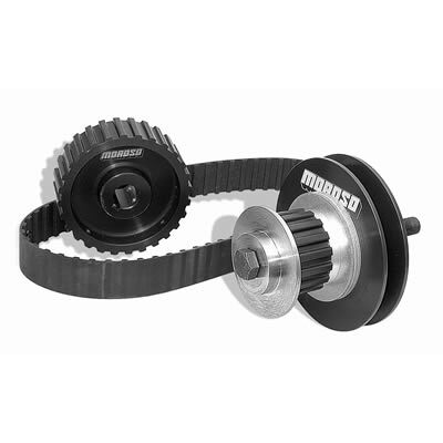 These drag race oil pump drive kits from Moroso fit most popular drive setups. They drive the oil pump at 57 percent of crankshaft speed, and work with all Moroso dry sump pumps and external oil pumps. All necessary hardware, including Grade 8 fasteners, hard coat anodized Gilmer gears, and correct-length drive belts, is included.