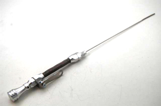 Designed to bolt to block from the inside of headers. Aluminum handle, braided housing and stainless steel dipstick. Anodized Finish.
