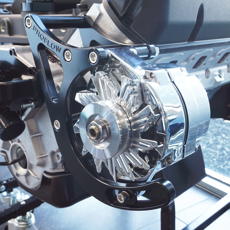 Proflow's billet aluminium alternator brackets feature alternative, sleek styling from their original brackets. They're precision CNC-machined from solid billet 6061-T6 aluminium for superior strength and reduced weight. The brackets will fit perfectly and handle high torque and vibration easily. These brackets are available in polished and black aluminium and are Show Car Quality.