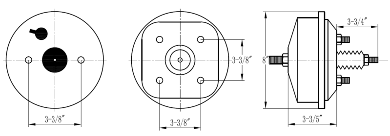 - Master cylinder mount studs are 3/8 x 18 and 1-1/16" long and 3-3/8" on center