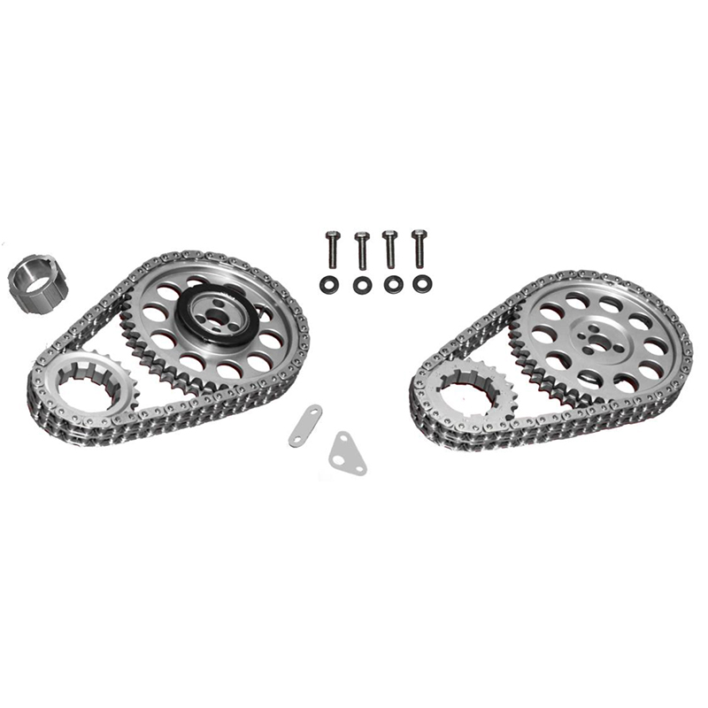 Gold sets are nitride hardened and include a one-piece Torrington bearing with an Iwis chain. Timing chain sets have 9 keyways unless otherwise stated. Smaller bores tend to be best suited to 7 crank keyways, although engines like Small Block Chevrolets etc. come with 9 keyways which allows more adjustment for dialling in the cam. Crankshaft sprocket keyways are in 2-degree increments unless otherwise noted. The relationship from crank keyway to camshaft sprocket timing is 2:1 meaning that the amount of advance or retard at the camshaft is in one-degree increments, IE 1, 2, 3 or 4 degrees. Multiple keyways are a solid fixture and do not tend to move or work loose like offset dowels, thus providing a positive locking of the cam timing to what ever position is desired.