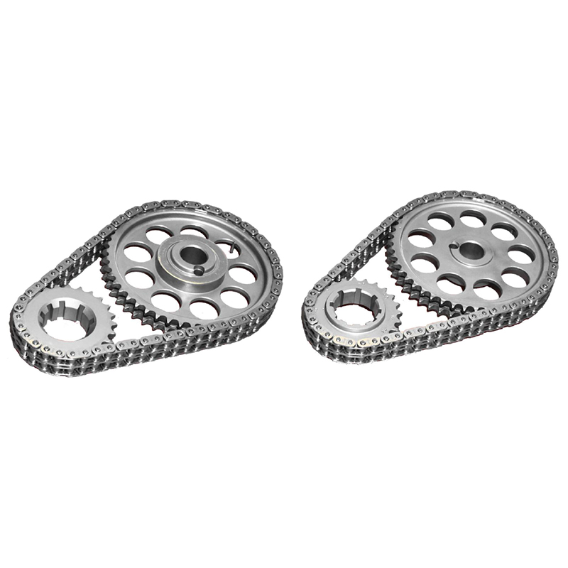 Gold sets are nitride hardened and include a one-piece Torrington bearing with an Iwis chain. Timing chain sets have 9 keyways unless otherwise stated. Smaller bores tend to be best suited to 7 crank keyways, although engines like Small Block Chevrolets etc. come with 9 keyways which allows more adjustment for dialling in the cam. Crankshaft sprocket keyways are in 2-degree increments unless otherwise noted. The relationship from crank keyway to camshaft sprocket timing is 2:1 meaning that the amount of advance or retard at the camshaft is in one-degree increments, IE 1, 2, 3 or 4 degrees. Multiple keyways are a solid fixture and do not tend to move or work loose like offset dowels, thus providing a positive locking of the cam timing to what ever position is desired.