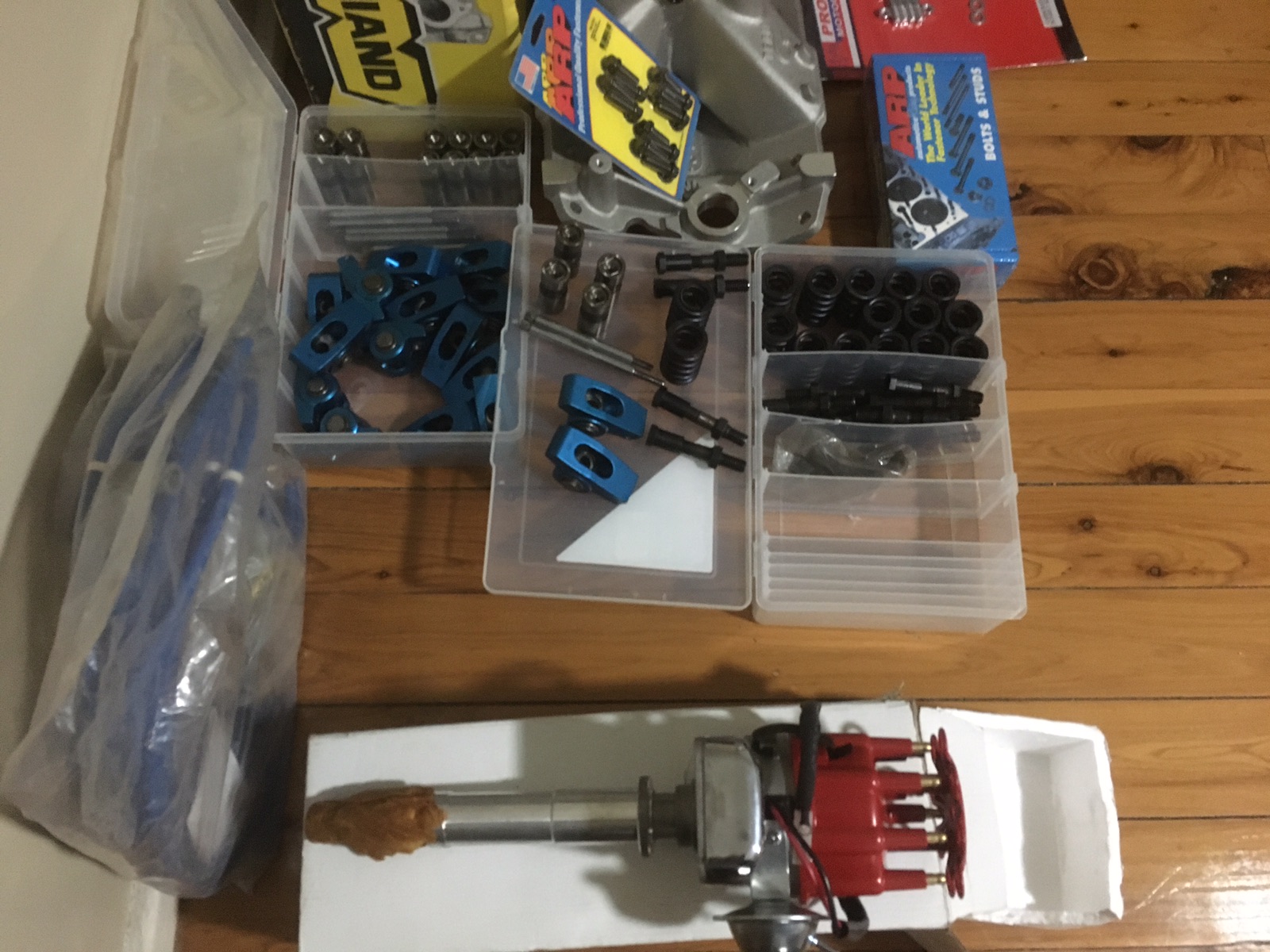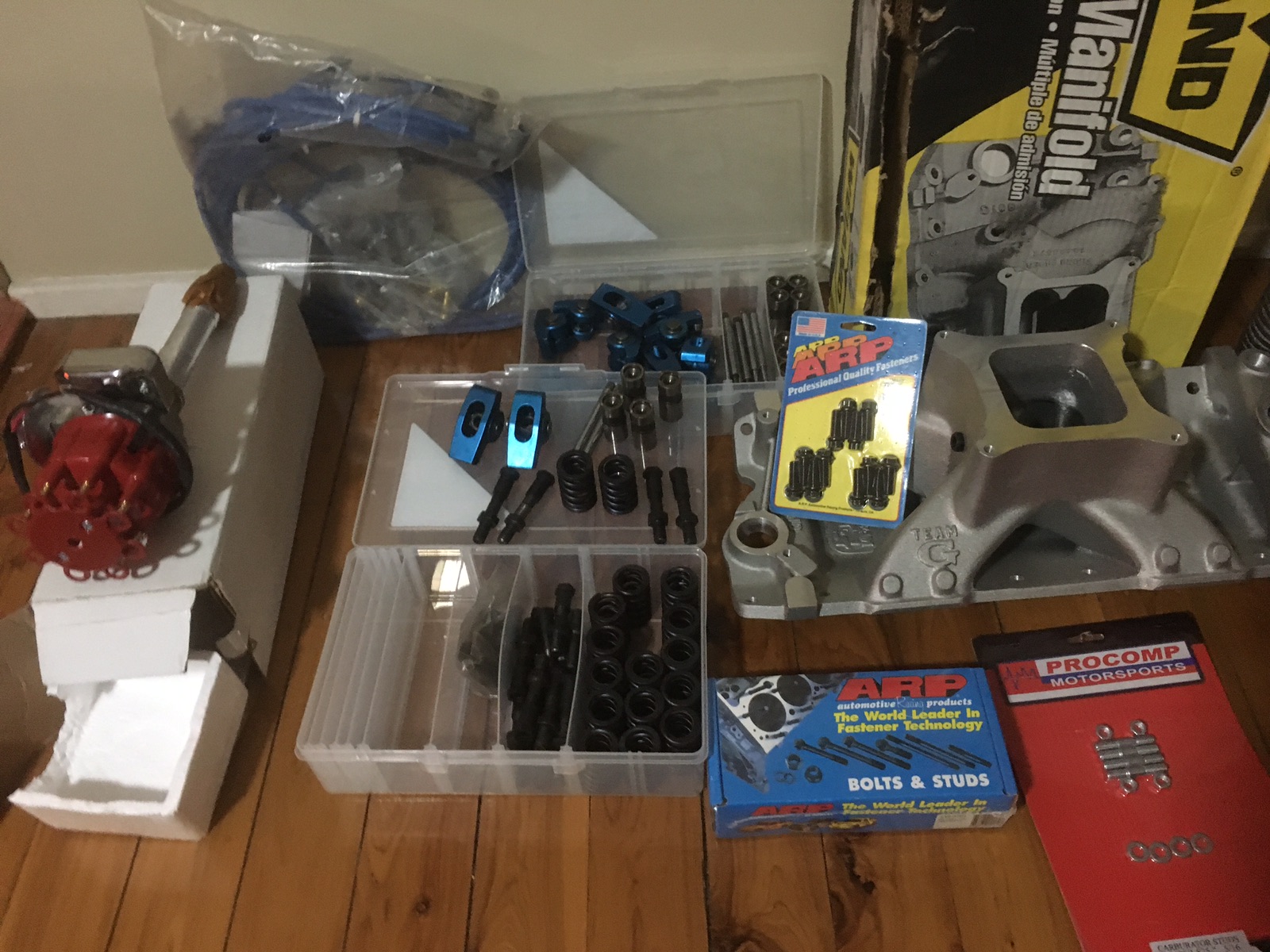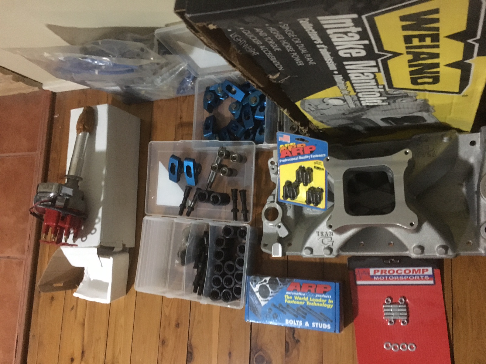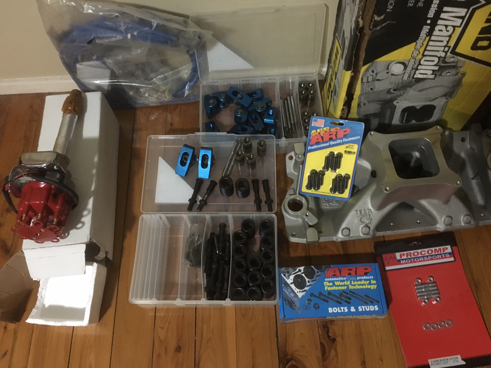 Weiland manifold Electronic dIzzy 8m leads ARP manifold kit Carby manifold stud kit Pro comp 1.5 roller rockers Posi lock stud kit ARP head bolt kit HD springs Hyd lifters Selling as one lot will post at your expense Leave a message if phone not answered Will not seperate