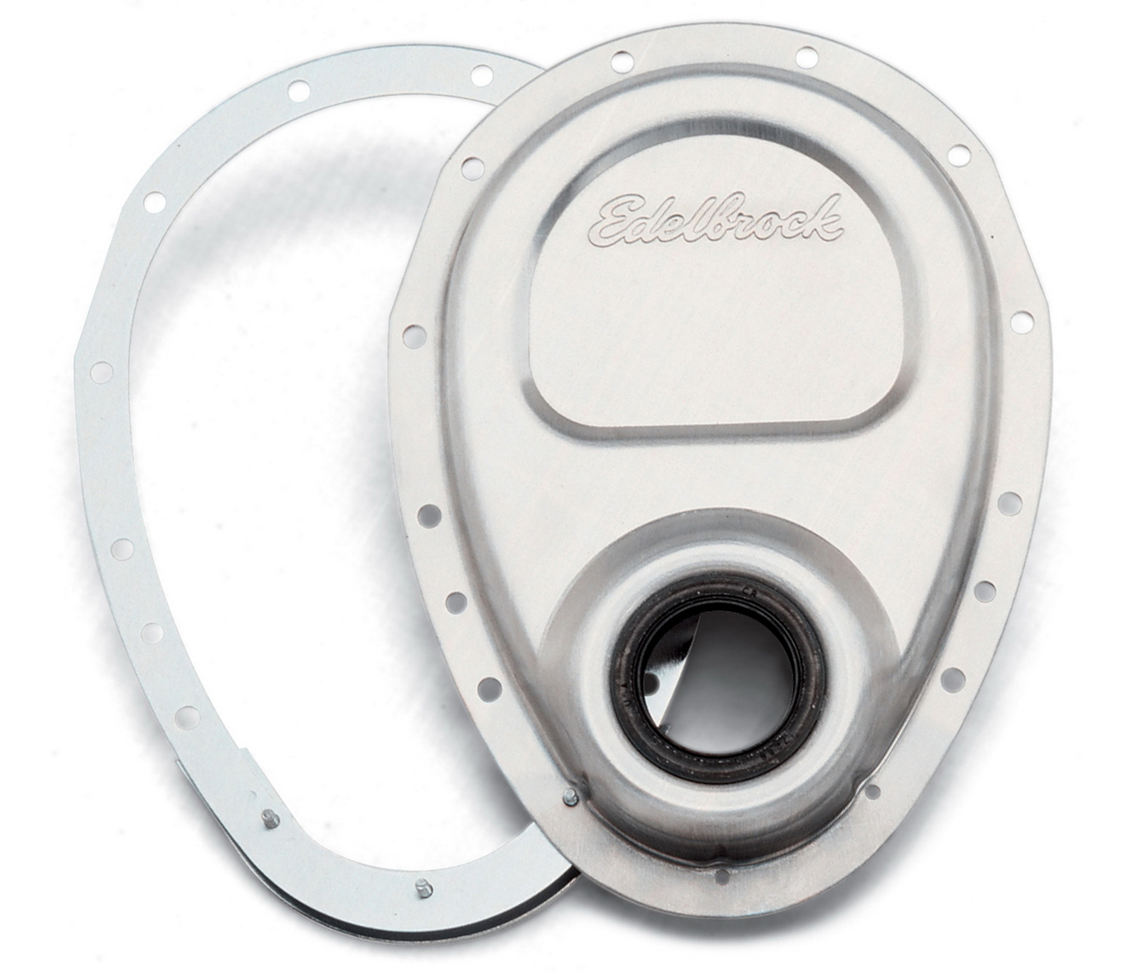 This die-stamped two-piece front cover for small-block Chevys is made from .090" aluminum for light weight and excellent strength. This attractive and unique design allows quick camshaft removal without dropping oil pan or breaking oil pan seal. Includes all necessary gaskets, bolts and seals. Will not fit 1987 and later engines. Note: If cam button is desired, a nylon cam button must be used.