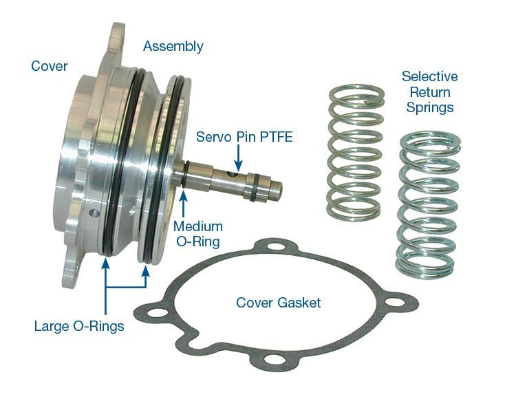 Since its introduction in 1969 with the 428 SCJ, the R code servo has remained the trick piece for C6 builders needing additional band apply force. Sonnax R code servo kit K36528R for C6 (mid 68-later) units features a no-leak pin which uses one O-ring and one PTFE ring to eliminate back pressure and leakage due to worn case bores. A replacement seal kit K36528R-SK also is available.