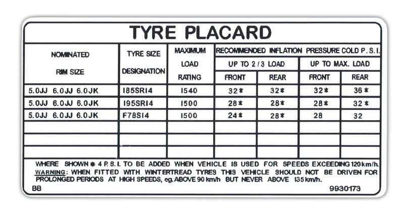 TYRE PLACARD HQ UTE VAN 8 CYLINDER