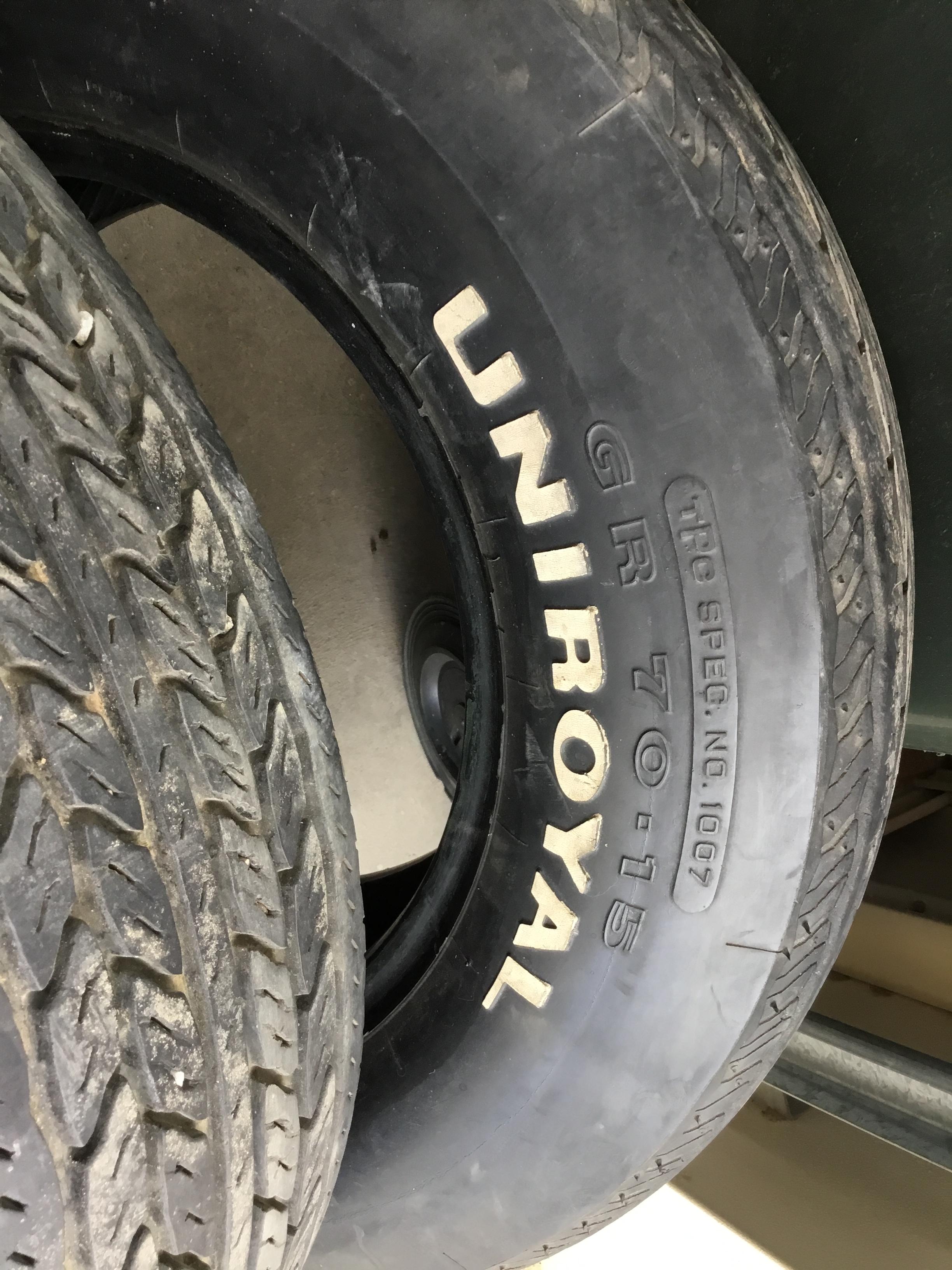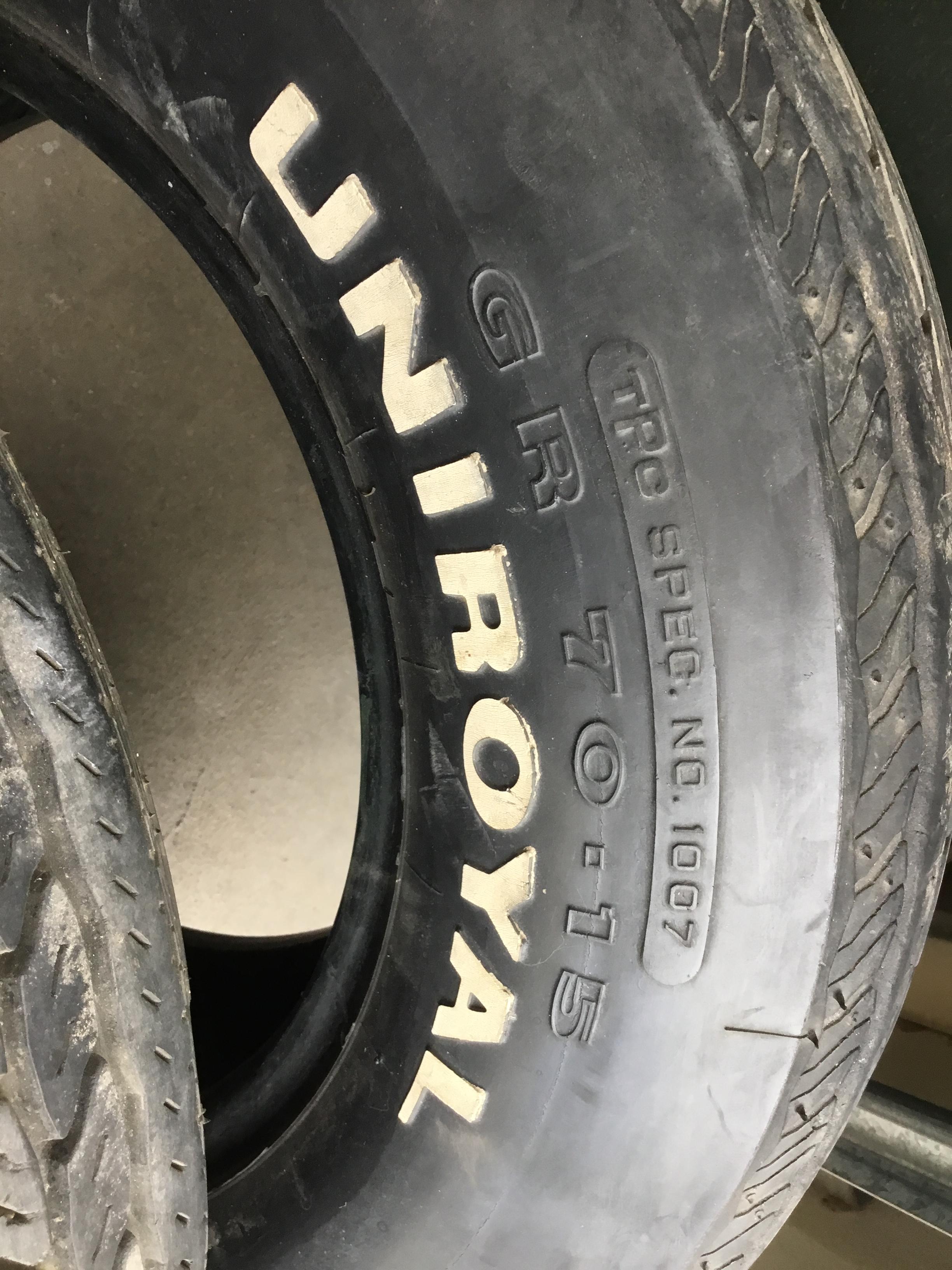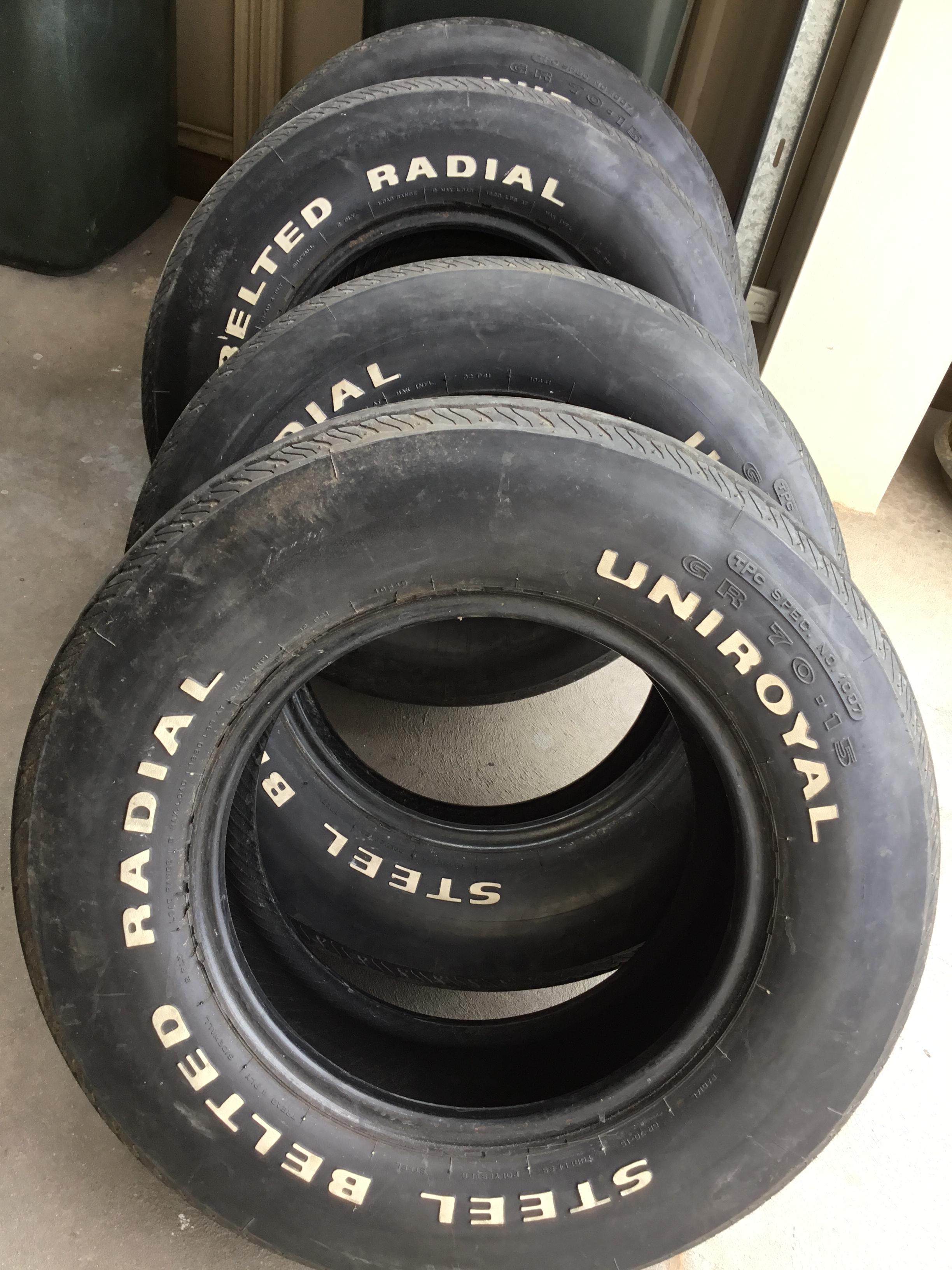 I have 4 vintage Uniroyal steel belted radials with raised white letters. Size GR70 X 15. The DOT date code is APU5 CX 058 which according to Uniroyal means that they were manufactured in the 5th week of 1978 (could possibly be 1988) but due to the fact that my car has not been registered since 1986 is more likely to be 1978. Tyres are in extremely good condition for the age with excellent tread and no visible cracking or damage to sidewalls. These are the tyres that you need to be period correct if you are restoring a vehicle from this era and you would be very unlikely to find another set of tyres in this good condition. Located in Canberra.