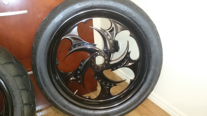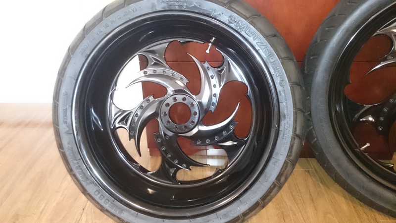 Sizes are, Rear 18x8.5, Front 21x3.5 fitted with Metzeler ME880 tyres, 260/40-18 and 140/70-21.